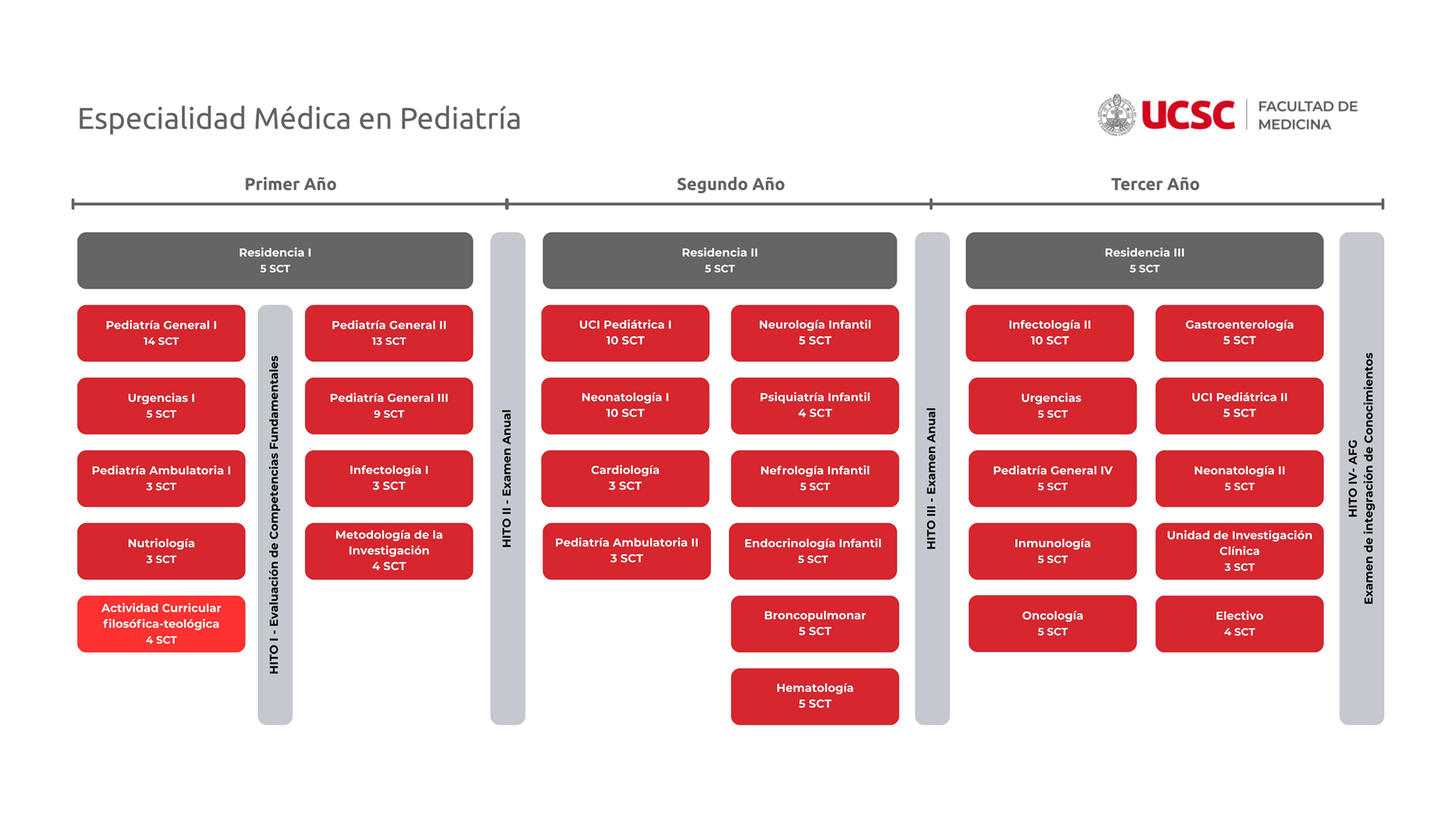 El programa de Especialidad Médica en Pediatría de la Universidad Católica de la Santísima Concepción forma médicos especialistas capaces de diagnosticar, tratar y prevenir los problemas de salud del niño, la niña y el adolescente, integrando el enfoque biopsicosocial y familiar. Posee un fuerte componente práctico, con formación en hospitales y centros de atención primaria, y promueve el desarrollo de competencias clínicas, investigativas, de gestión y docencia. El residente se forma bajo un modelo ético, humanizado y centrado en el paciente, coherente con la identidad católica de la UCSC.